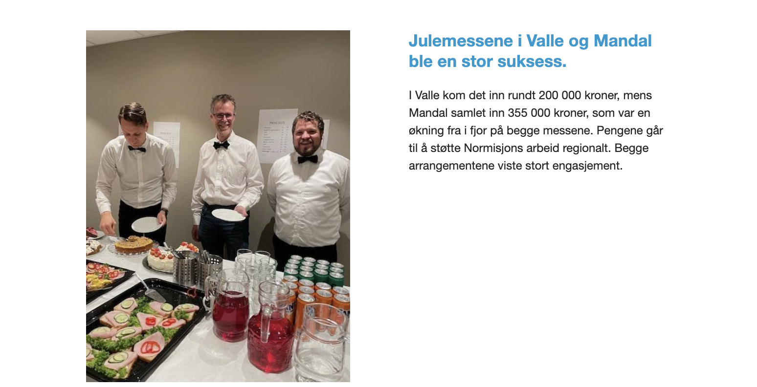 I forrige nyhetsbrev står det at det kom inn 300 000 under julemessa i Valle. Dette er feil beløp, det kom inn ca. 200 000. Uansett er dette et veldig godt resultat. Takk for innsatsen både i Valle og i Mandal.
