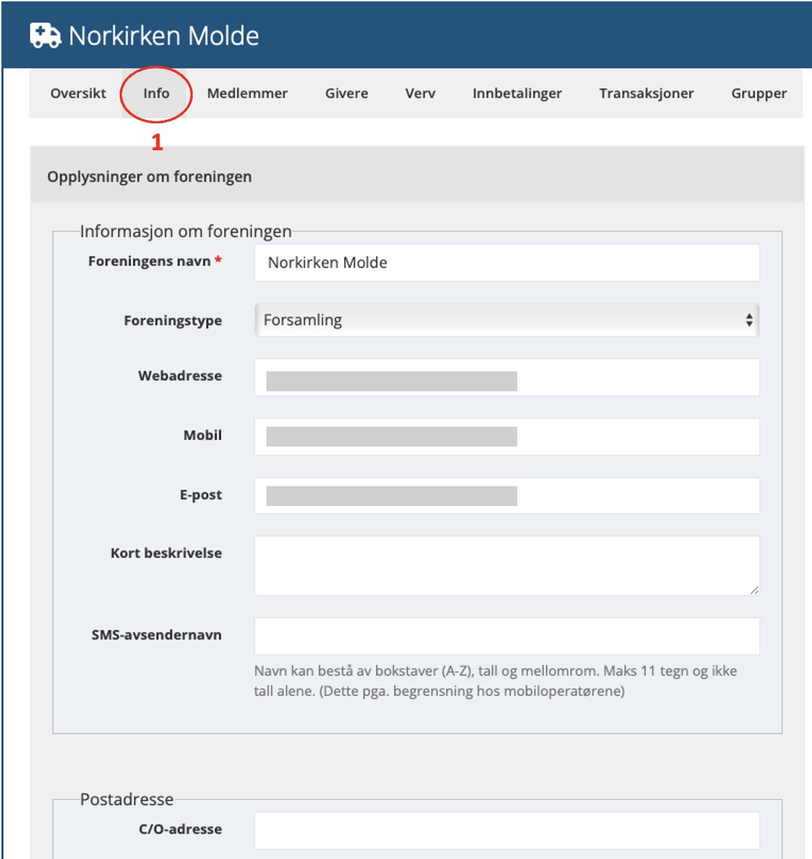 1) For å redigere informasjonen om lokallaget/menigheten i MinSide går vi til fanen Info. Her kommer all den informasjonen som er registrert på lokallaget/menigheten opp, og vi kan endre eller legge til det som trengs. Det kan eksempelvis være lurt å legge til lokallagets/menighetens navn under SMS-avsendernavn, om man benytter seg av SMS-utsendelser.