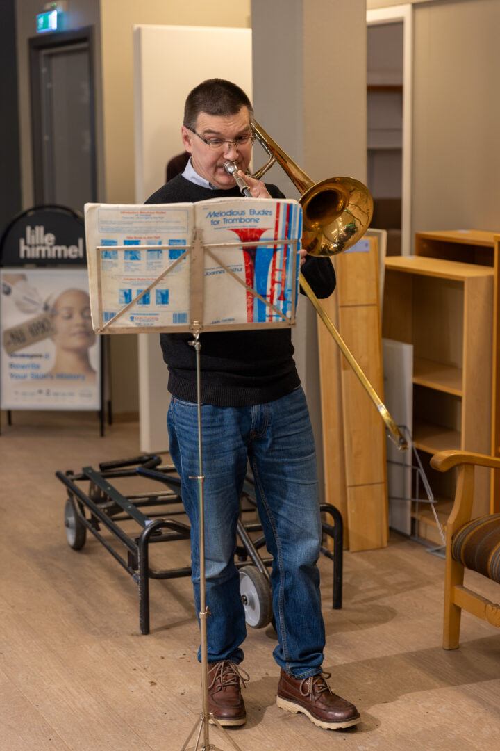 Butikkleder Anne Breen ønsket velkommen til åpningen etter toner fra trombonist Georgy Kalmikov.
