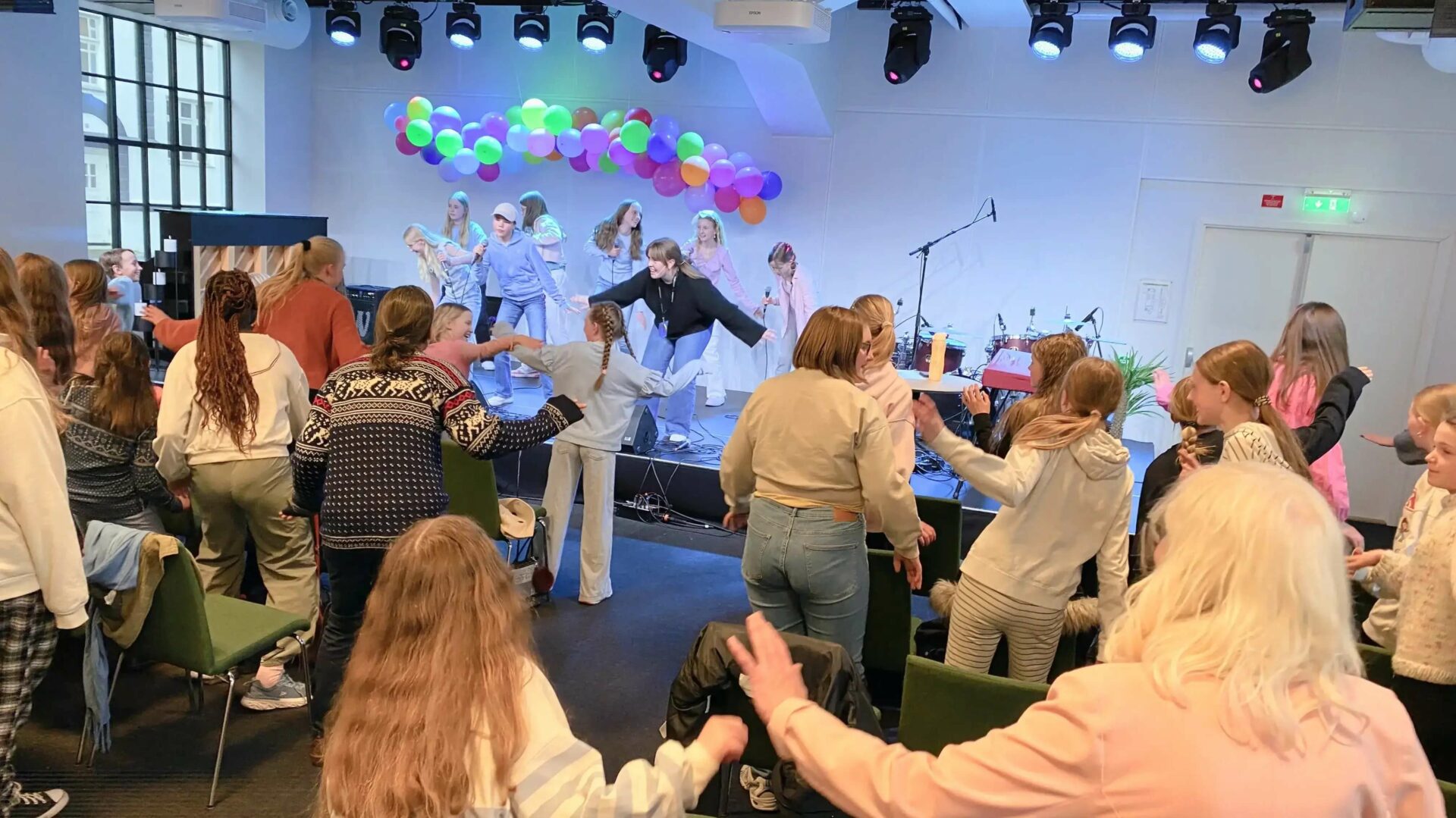 Kveldsmøtet, i ein fullsatt festsal på Nordhordland fhs, starta med eit opningsshow ved underholdningskomiteen før det haldt fram med lovsang leia av lokale ungdommar.