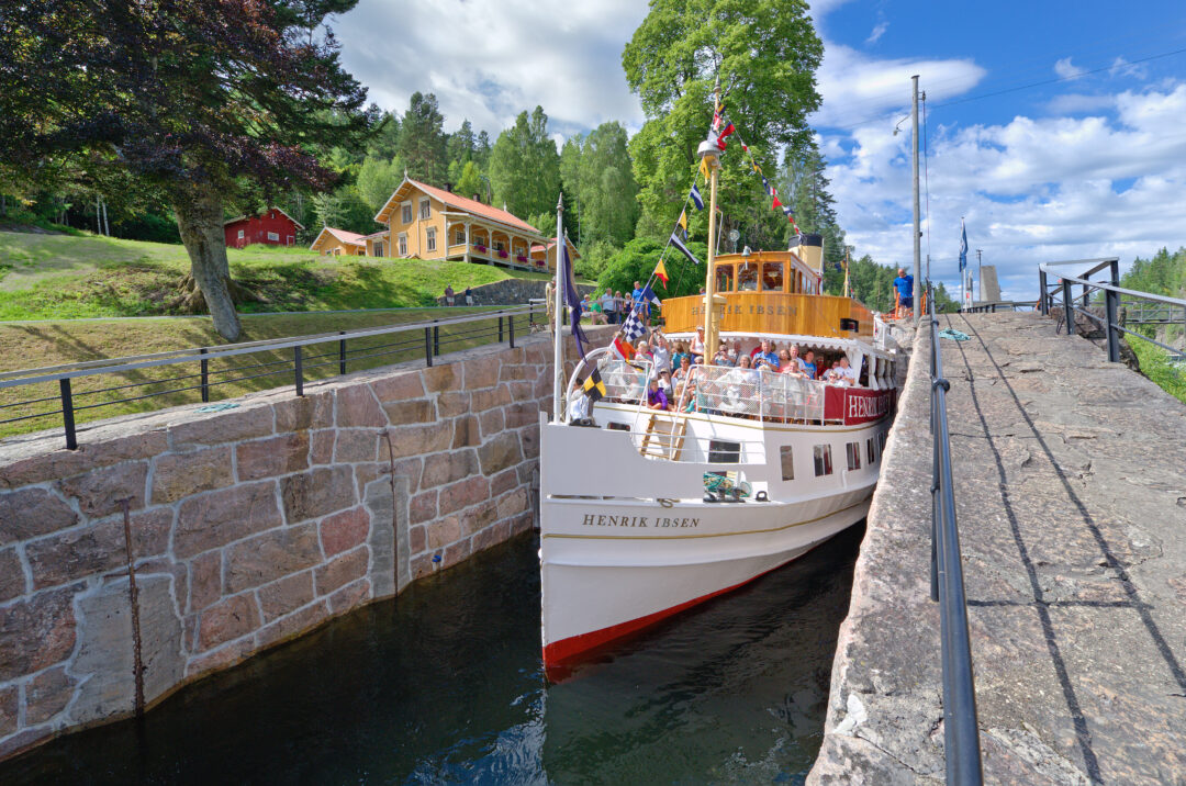 I løpet av turen i Telemark inngår en tur på Telemarkskanalen fra Lunde til Skien. Her er M/S Henrik Ibsen i Vrangfoss sluse. Foto: Kåre S. Pedersen